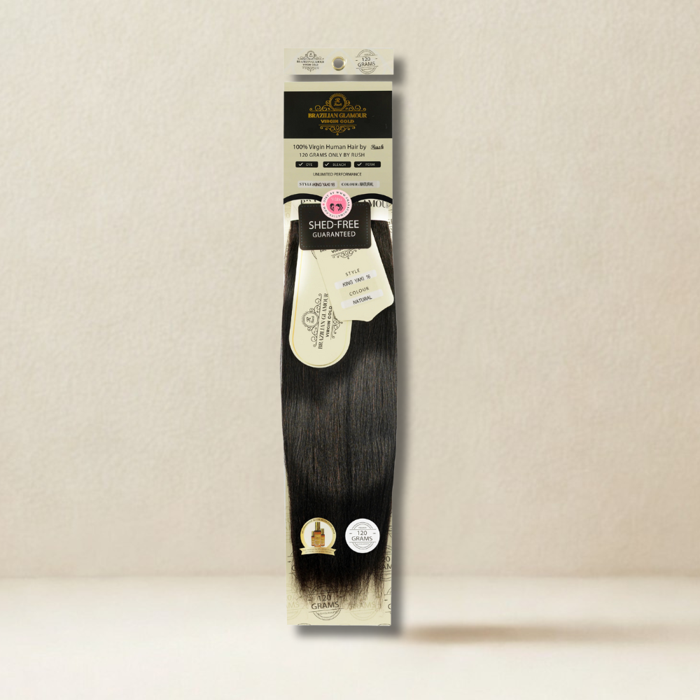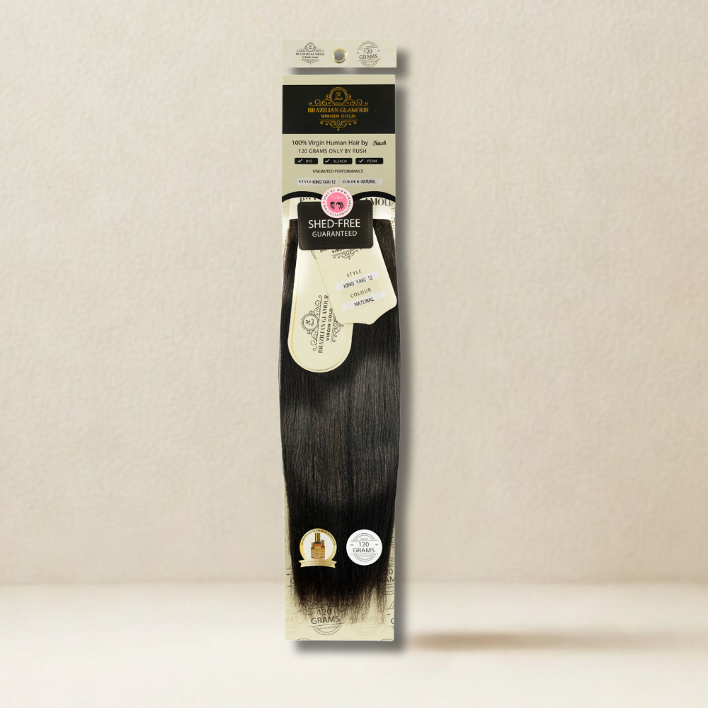 Get the ultimate natural-glam look with RUSH Brazilian Glamour Virgin Gold King Yaki Weave – 120g, designed for fullness, softness, and effortless styling.
