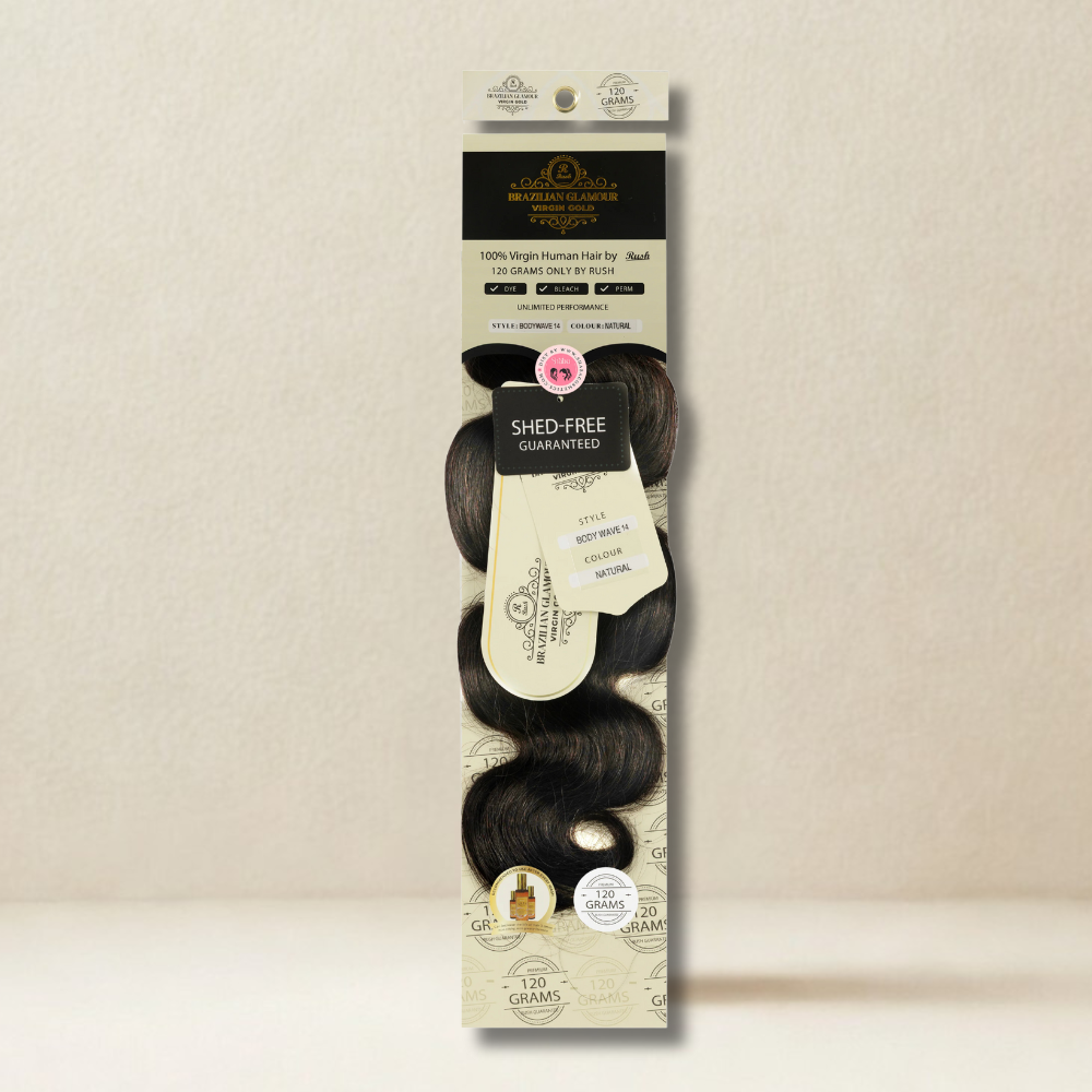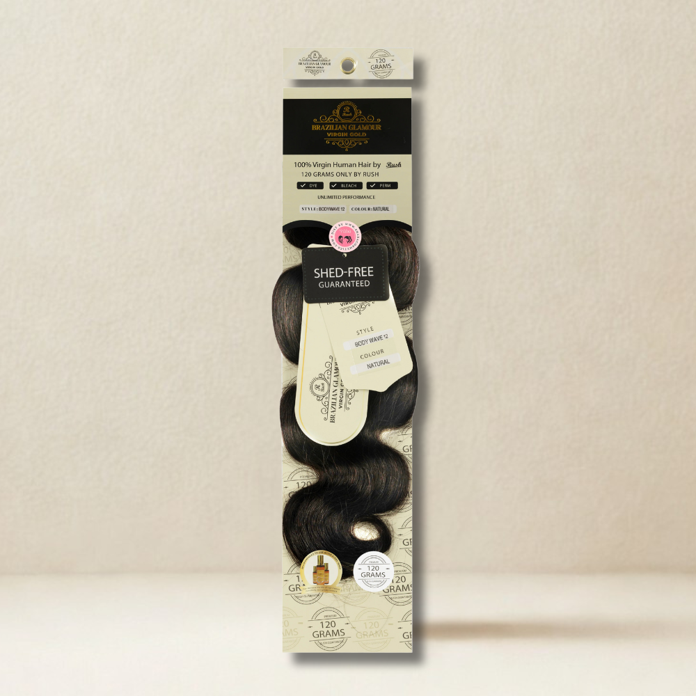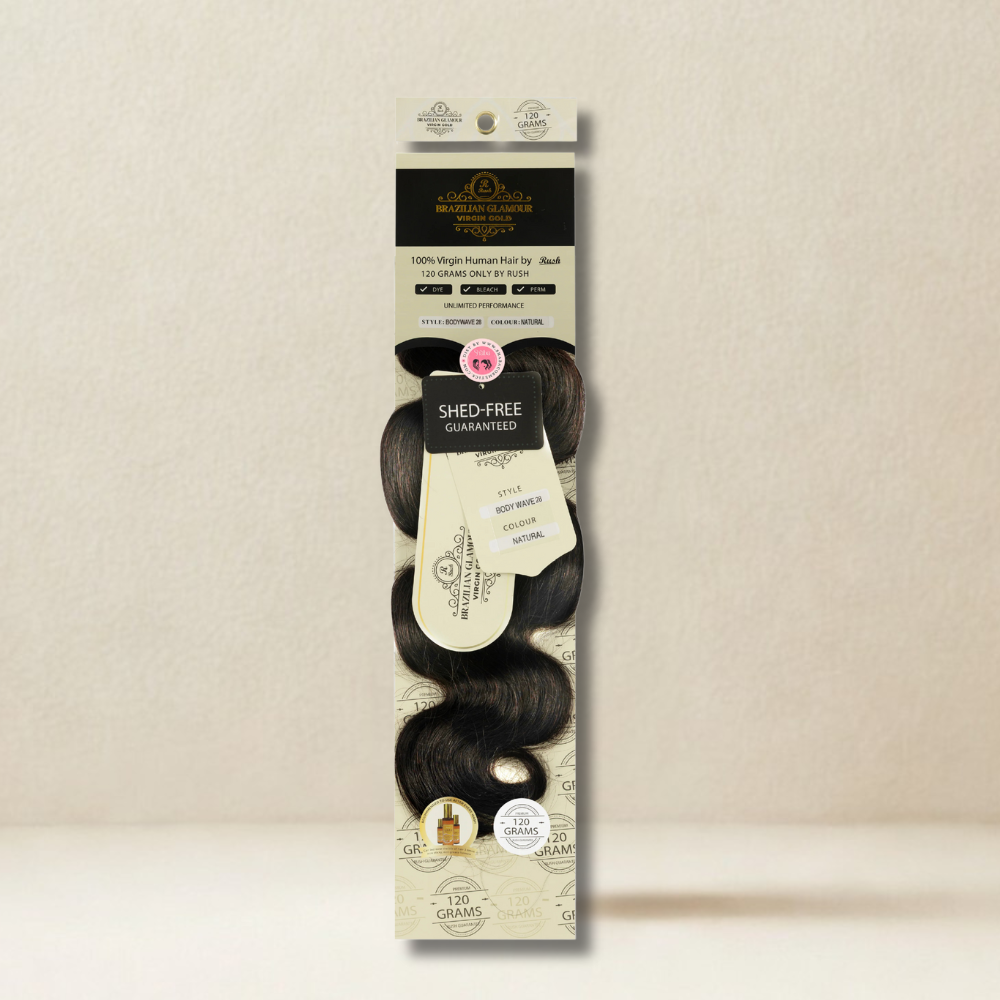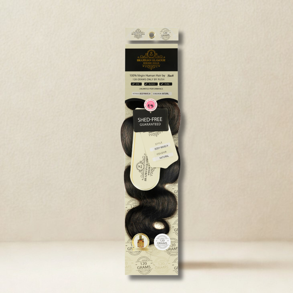 Transform your style with the luxurious RUSH Brazilian Glamour 100% Virgin Gold Human Hair Body Wave Weave. Crafted from pure, unprocessed virgin human hair, this premium weave delivers a soft, silky texture, natural shine, and beautiful body wave pattern that blends effortlessly with your own hair.
