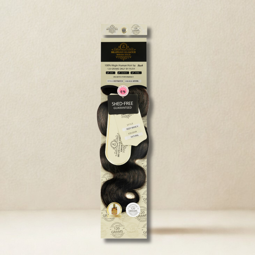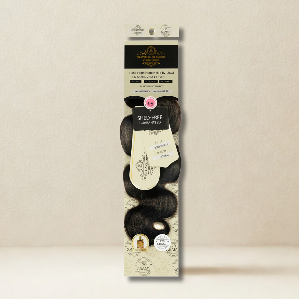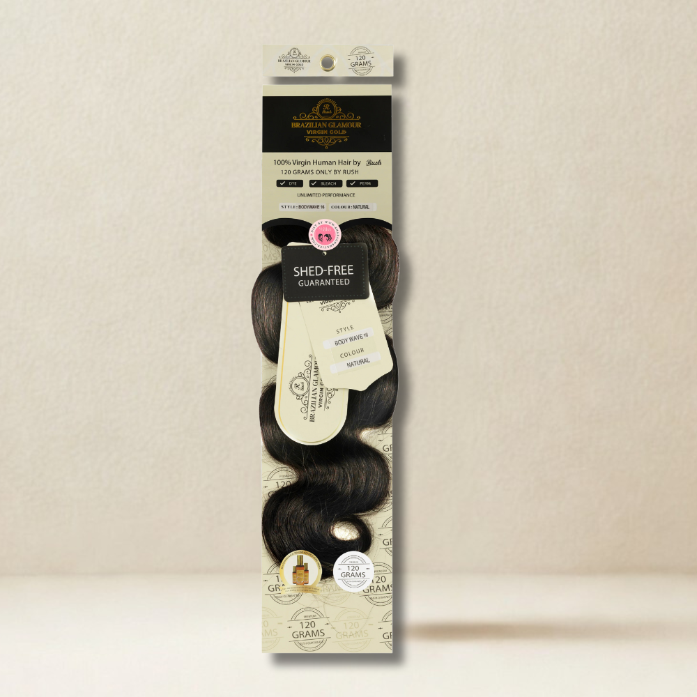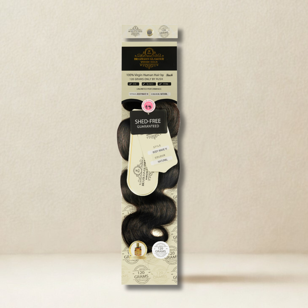 Transform your style with the luxurious RUSH Brazilian Glamour 100% Virgin Gold Human Hair Body Wave Weave. Crafted from pure, unprocessed virgin human hair, this premium weave delivers a soft, silky texture, natural shine, and beautiful body wave pattern that blends effortlessly with your own hair.